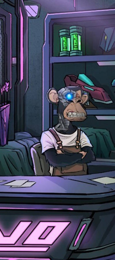 As an Evolution Apes, you’ll rub shoulders with digitised primates of all kinds – from the elite BAYC, SLAPES and MAYC crews who pass through to the mechanised Evo Shop masterpieces of the v1 Evolution Ape team ourselves.